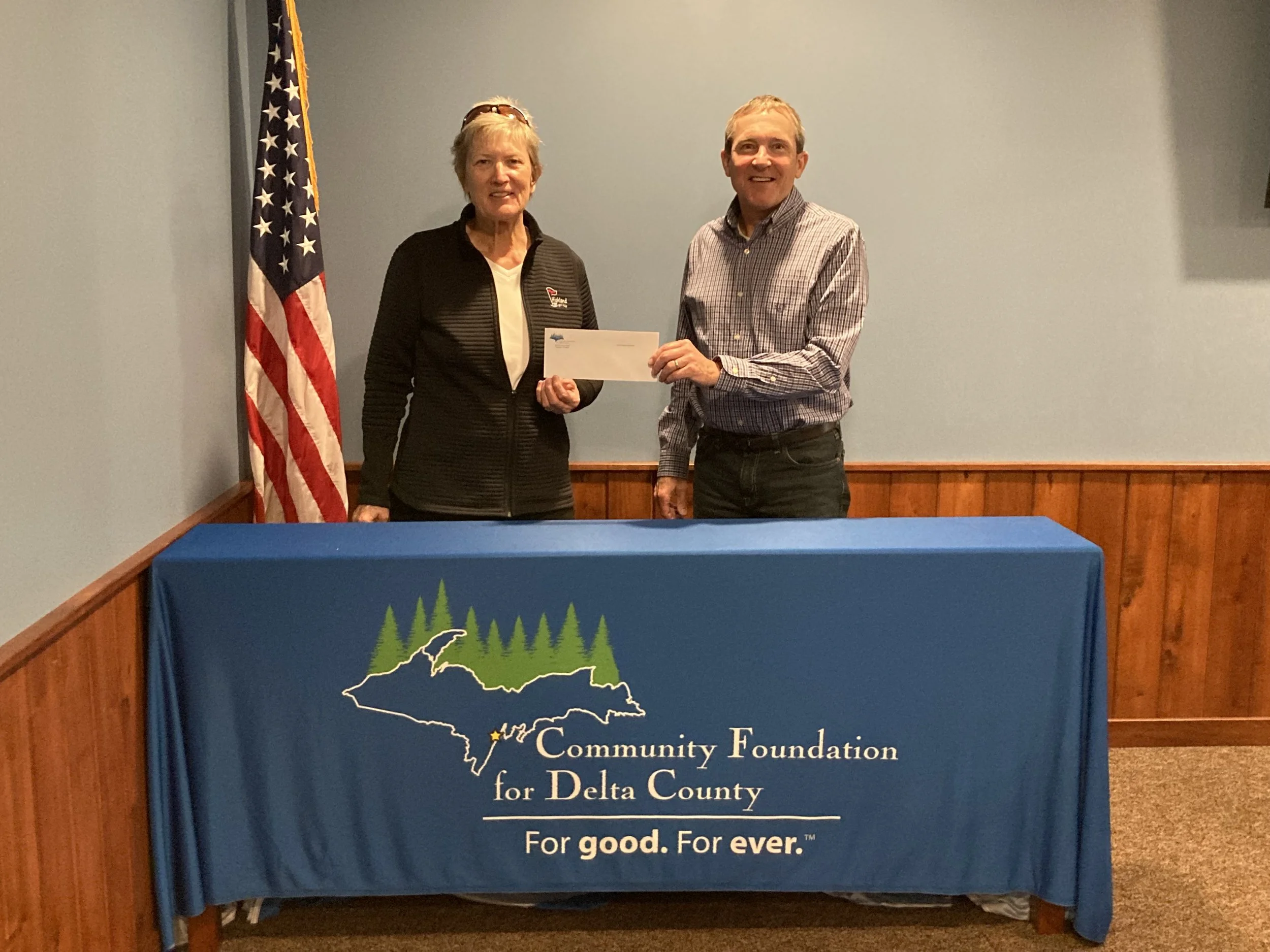 Charlie Becker, Chair of the Community Foundation for Delta County, is shown here accepting a check from Anne Okonek to create the Candace Swetkis Memorial Endowment Fund.