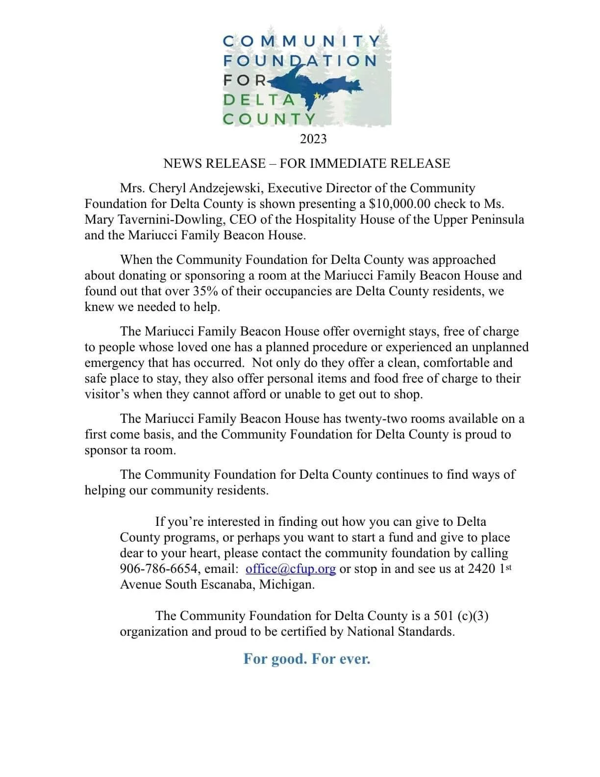 Community Foundation for Delta County presents check to Mariucci Family Beacon House.