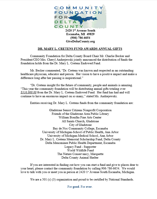 Alyssa Sullivan April 20, 2026 Dr. Mary L. Cretens Fund Awards Annual Gifts Alyssa Sullivan April 20, 2026 Dr. Mary L. Cretens Fund, of the Community Foundation for Delta County, Awards Annual Gifts.